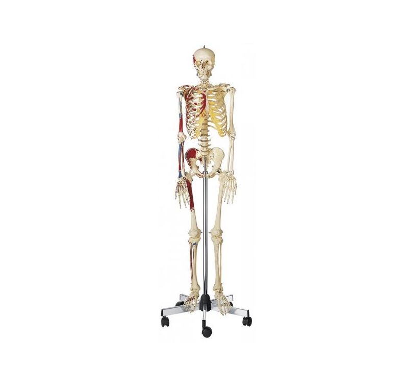 Figura masculina, modelada a partir d'un model real, fabricada amb SOMSO-Plast®. Reproducció fidel de lestructura òssia amb tot detall anatòmic. Crani amb volta cranial i mandíbula extraïbles. Les articulacions són mòbils; les extremitats superiors i inferiors són extraïbles. Els peus dret i esquerre es poden separar de les cames. A la banda dreta del cos, els punts d'origen i inserció dels principals músculs, des del cap fins als peus, estan codificats per colors (origen vermell, inserció blava). A la banda esquerra, els ossos individuals estan numerats. Es manté dret sobre una base amb rodes. Alçada de l'esquelet: 170 cm.