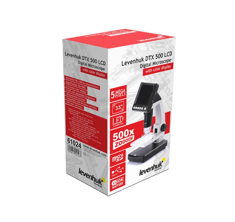 El microscopi digital per a sòlids Levenhuk DTX 500, amb la seva pantalla LCD de 3.5", et permet estudiar mostres a un nivell d'augment que va de 20x a 500x, i guardar els resultats del teu treball en format imatge o de vídeo en una targeta MicroSD. Els 8 LEDs de la lent il·luminen a la perfecció la zona de treball, a part d'assegurar un consum elèctric mínim, al qual també contribueix un efectiu sistema d'ajustament de la brillantor.