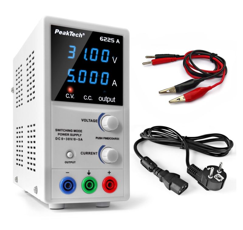 Aquesta font dalimentació de laboratori ofereix una sortida de voltatge controlable de 0-30V o 0-5A DC. El corrent i el voltatge poden ser ajustats mitjançant els potenciòmetres digitals, sent possible ajustar els valors fins i tot amb les preses de sortida apagades. Pressionant el control rotatiu de corrent o voltatge, la resolució de l'ajustament es pot canviar de 10mA a 100mA o de 10MV a 1V. Per garantir una mesura fiable, hi ha un botó al frontal del PeakTech 6225A per encendre i apagar la sortida de voltatge de forma controlada. El display també mostra quan hi ha la sortida activa. També destaquen les funcions CV i CC, que permeten establir valors constants de voltatge i corrent, constants encara que es connecti una càrrega. Totes aquestes funcions fan del PeakTech 6225 A un company valuós per a qualsevol aficionat o especialista de l'electrònica.