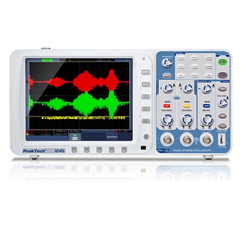 El PeakTech 1245 és un oscil·loscopi d'emmagatzematge digital de 100 MHz i 2 canals, amb un display TFT a color d'alta resolució i un gran nombre de funcions extra. Té una taxa de mostreig de 1GS/S, presentant una gran qualitat i alta facilitat de maneig amb un gran equilibri preu/rendiment. L'alta profunditat de memòria de 10 milions de punts i la facilitat d'ús asseguren un exercici eficient en l'anàlisi de senyal en indústria, laboratoris i formació.