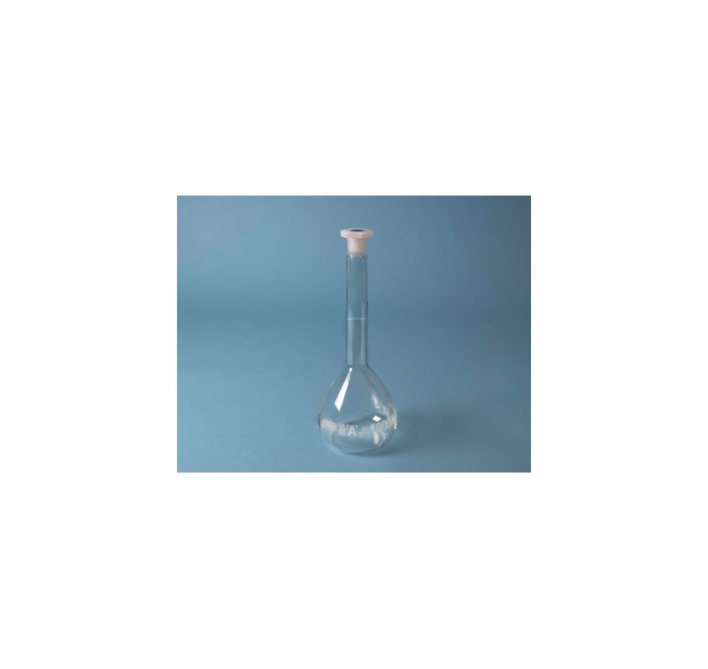 Matràs aforat vidre amb tap plàstic. Capacitat 100 ml