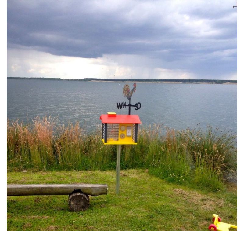 L'estació meteorològica resistent als raigs UV conté un penell giratori, un pluviòmetre i un panell d'instruments amb termòmetre de màxima i mínima temperatura, baròmetre i higròmetre.