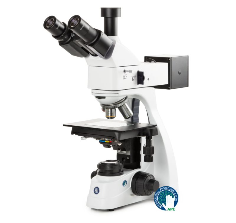 Il·luminació Köhler NeoLED™ de 3 W amb intensitat reflectida ajustable amb font d'alimentació externa, polaritzador giratori tipus push-pull i analitzador push-pull, condensador integrat amb diafragma de l'iris i diafragma de l'iris de camp. Disc de filtre giratori integrat amb filtres verd, blau, groc i blanc.
