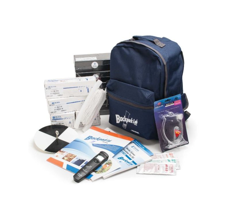 Backpack specially designed for educators and students, contains test kits for the analysis of 15 important parameters of marine science: acidity, alkalinity, ammonia, carbon dioxide, dissolved oxygen, nitrite, nitrate, phosphate, salinity, specific gravity, turbidity, pH, EC, TDS and temperature.