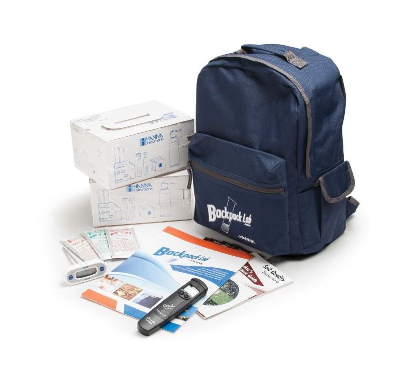 Backpack specially designed for educators and students that contains test kits for the analysis of the seven main soil parameters: nitrogen, phosphorus, potassium, pH, EC, TDS and temperature.