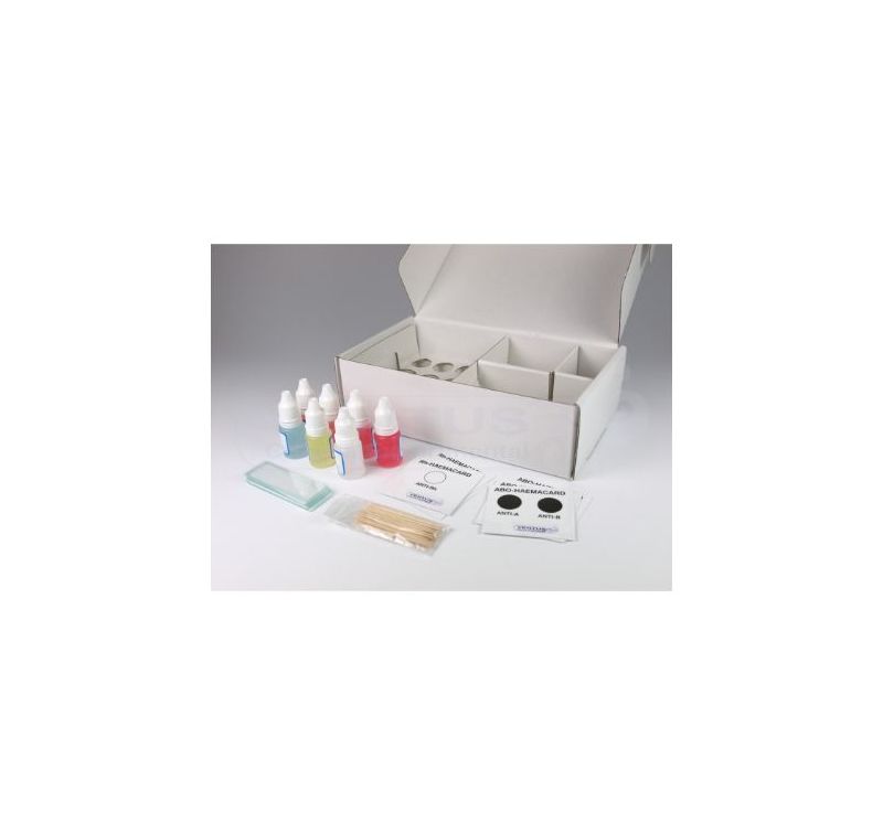 To determine groups A, B, AB and 0 as well as Rh with blood and artificial sera. Includes 4 bottles with artificial blood from different subjects; anti-A, anti-B and anti-Rh bottles; 8 cards (4 anti-A and anti-B and 4 anti-Rh); 8 slides to superimpose on the cards and do the tests; wooden chopsticks.