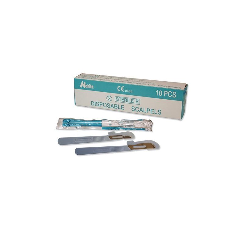 Sterile single-use scalpels with shape 10 blade. Box of 10 units