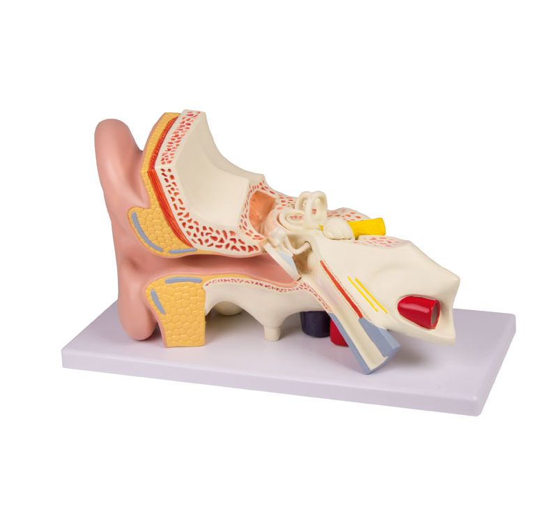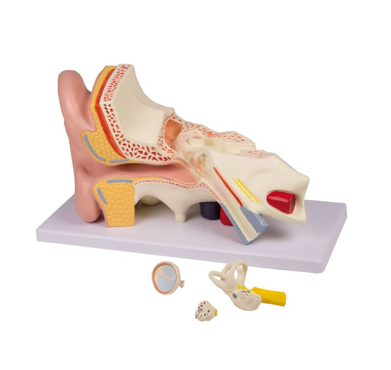 This model shows the details of the external, middle and inner ear in three times life size. The eardrum with malleus, incus and stapes can be removed. Additional removable part is the cochlea and labyrinth with vestibular and cochlear nerves, one half of the cochlea can be removed. Mounted on baseboard. Size: 36 x 16 x 20 cm, weight: approx. 1 kg