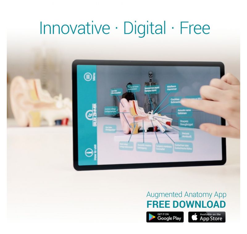 The new Augmented Anatomy App in combination with this high quality anatomical model makes learning now even easier and more efficient! This app automatically recognizes our anatomical models and displays the nomenclature in augmented reality. As an Erler Zimmer customer, you can use it completely free of charge and for an unlimited period of time.