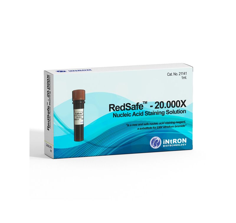 RedSafe™ Nucleic Acid Staining Solution (20,000x) is a new and safe alternative stain to Ethidium Bromide (EtBr) for the detection of nucleic acids in agarose gels. RedSafe fluoresces green when bound to DNA or RNA.