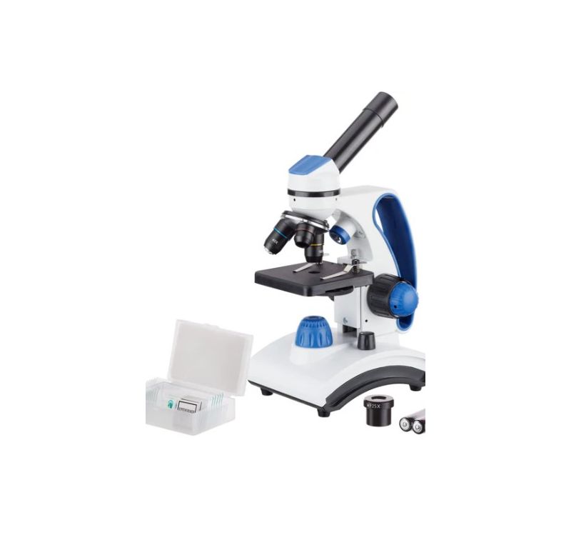 A 10-piece slide kit, with five biological specimens and five blank slides, is included to give the user a head start. Designed for students to learn science over years of continuous observations, it features full glass optics, a metal frame, two eyepieces (10X and 25X), a 360-degree rotating monocular head, and coarse and fine focusing. The light sources use a plug (adapter included) or three AA batteries (included). This microscope is perfect for academic studies at home for elementary through high school students.