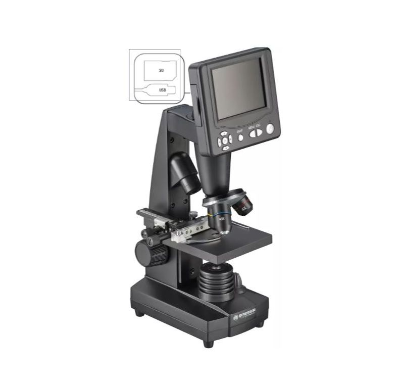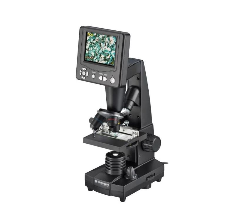 This student microscope, with its 8.9 cm (3.5") LCD monitor, allows several people to observe objects at the same time. The microscope can be used for transmitted light and (to a limited extent) reflected light microscopy.