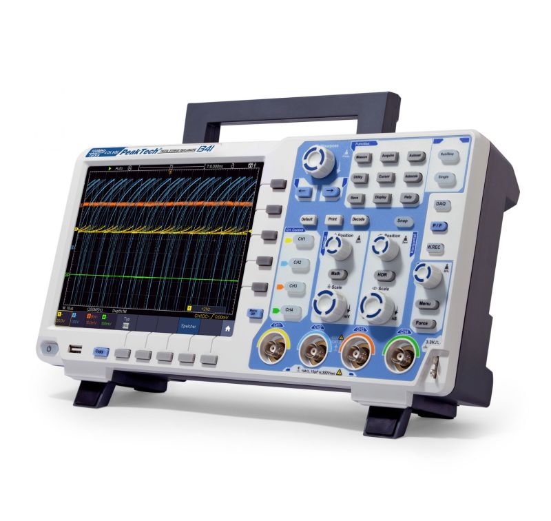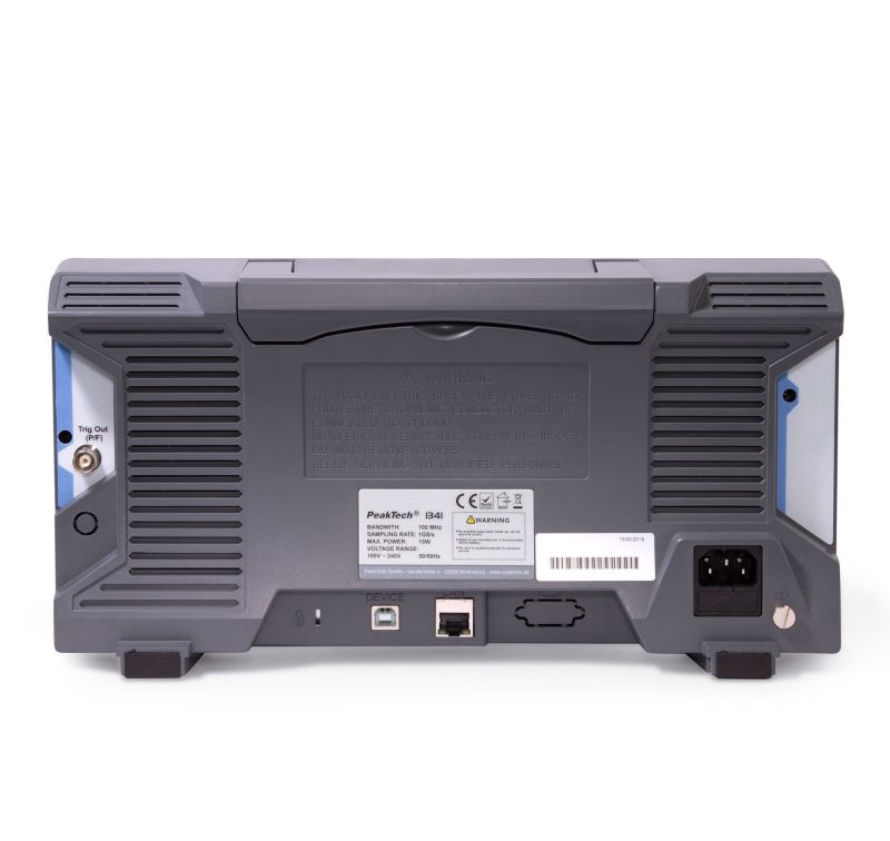 The PeakTech 1341 is a state-of-the-art 100 MHz, 4-channel digital storage oscilloscope with a high-resolution TFT color display and a large number of additional functions. It has a sampling rate of up to 1 GS/s and presents high quality and easy handling, with the best price-performance balance. All models in this series have XY mode and FFT function, as well as an integrated frequency counter. The information can be transferred to a PC via LAN or USB connection. The device can be used portable, with the possibility of adding an optional battery that allows the oscilloscope to operate for a whole working day without connection to the mains, while the waveforms can be stored on a USB pendrive.