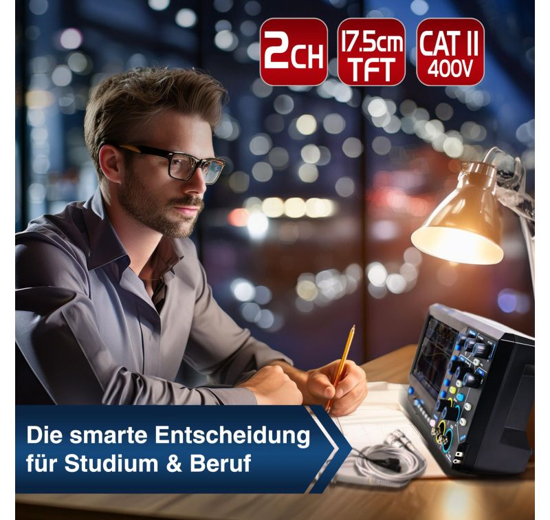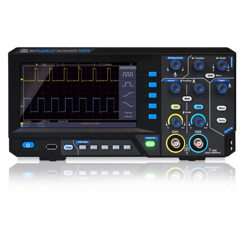 Specially developed for the education sector and hobbyists, this new series of full-scale digital storage oscilloscopes offers the best possible price-performance ratio without having to sacrifice functionality or technical features. Whether Autoset and Autoscale, mathematical measurement functions, FFT, Cursor or XY mode and even a zoom function, all standard market functions are already integrated in this series. The waveform data storage is internal with memory for 16 waveforms or external on a USB stick in TXT, CSV or BIN format, which can be read with the included software. The configurations can also be saved internally or screenshots of the screen can be saved externally. The waveform display can be achieved quickly and easily via the Autoset function, via AutoScale the measured waveforms can be displayed even more precisely according to the needs, although these adjustments can of course also be made completely manually via the key control.