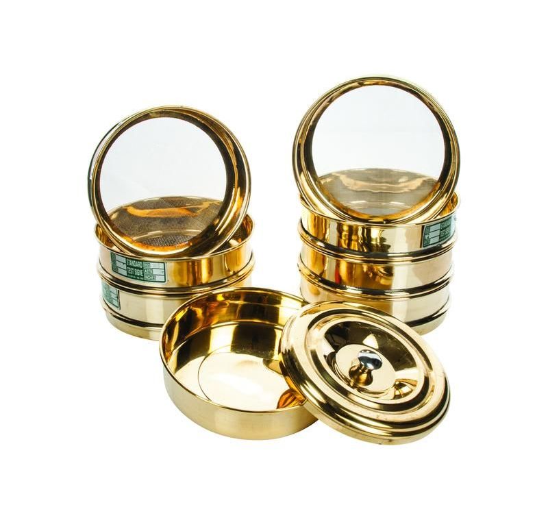 Set of 6 sieves made of 200 mmØ brass with the following mesh sizes: 2'00; 1'00; 0.50; 0'25; 0.125 i 0.063 mm. Supplied with lower tank and lid.