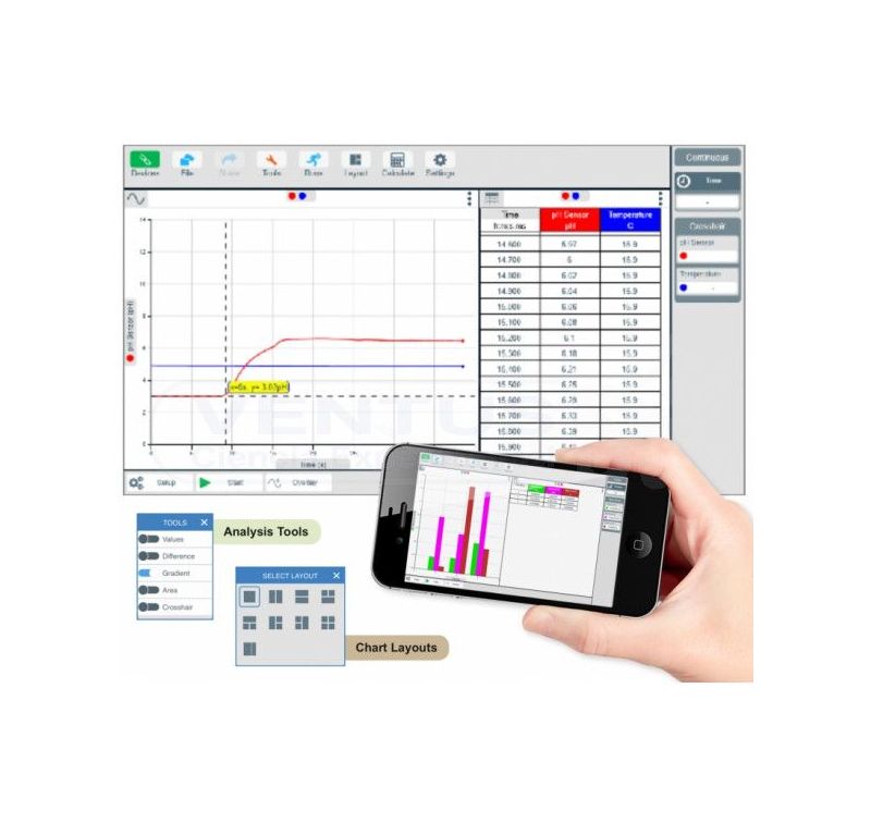 This console makes it possible to work with or without a PC connection for data collection, so it can be used as a desktop meter.