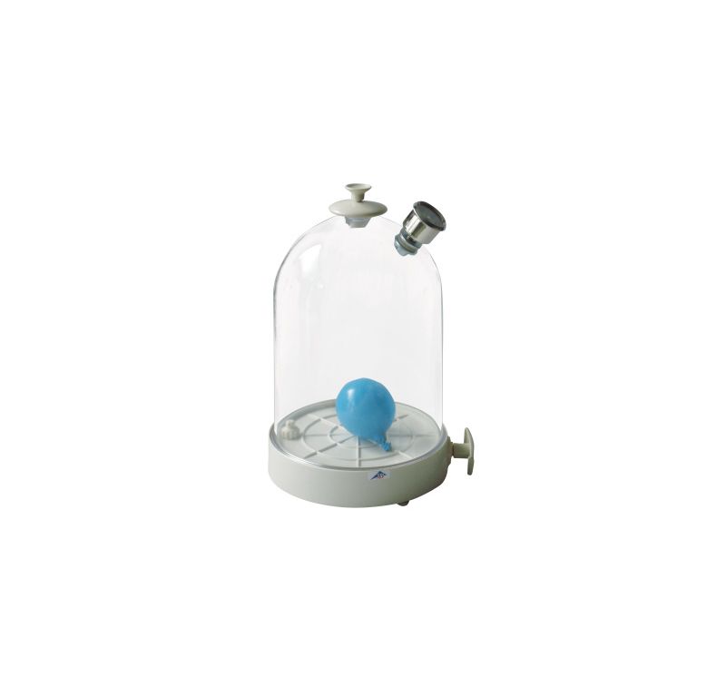 Modestly priced transparent plastic vacuum chamber for basic depression experiments. With the manual pump integrated into the bottom plate, the aeration valve and the pressure gauge, for measuring depression up to 330 hPa.