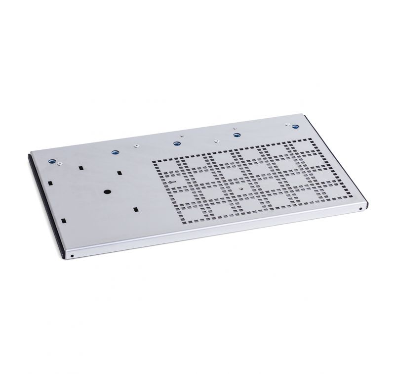 Safe base against overturning, made of stainless steel with five special threaded holes for fixing support rods without danger of tilting, threads for fixing the removable transformer and plug points for placing electrical mounting elements. With rubber feet.