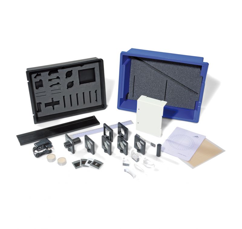 Set of devices for the student to carry out 23 fundamental experiments in Optics. In a stable plastic box with foam insert shaped according to the devices and transparent lid. Including a CD with experimentation instructions.