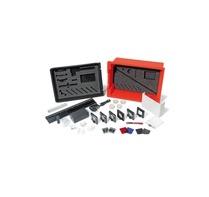 Set of apparatus for carrying out 38 experiments by students of geometric optics. In a stable plastic box with formed foam insert for the devices and with transparent lid. Includes CD with experimentation instructions. The experiments are carried out in a small space and yet clearly, on the optical bench that is delivered with the equipment. Alternatively they can be mounted on the SEA 1000789 (U8408035) base plate. In both cases, the optical components are arranged by means of sliding-free magnetic attraction. The supplied overlay masks predetermine the positions of the components.