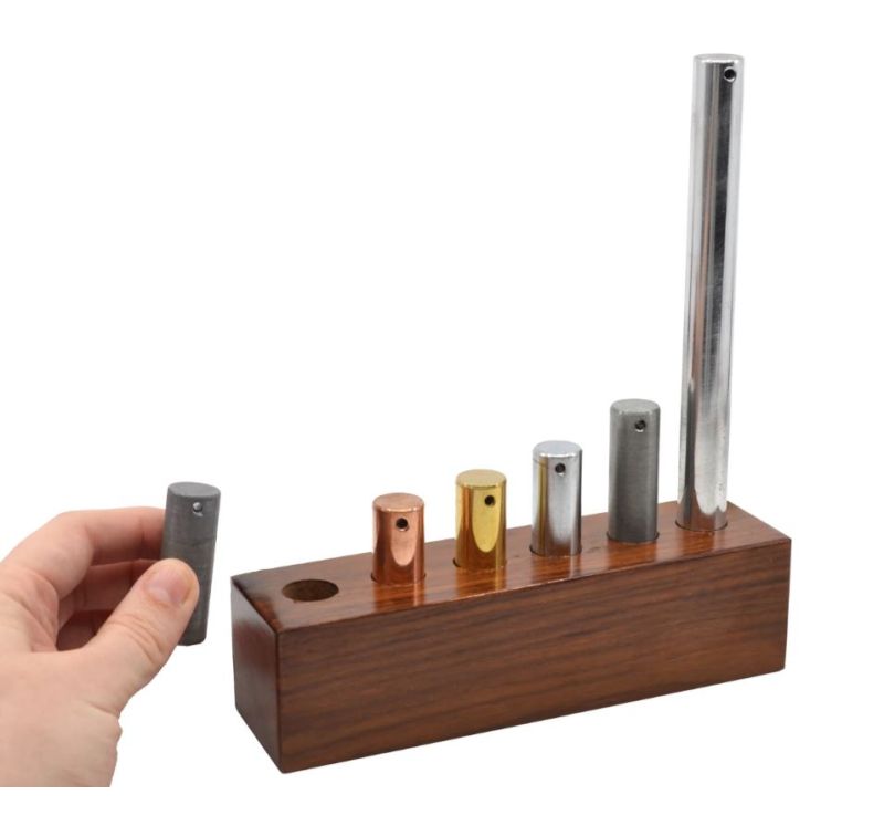 Set of 6 metal cylinders of equal mass. Includes copper, lead, brass, zinc, iron and aluminum. Each of the six metals in this set vary in length, from 5 cm to 19 cm, but have the same mass of 100 g and a diameter of 16 mm (0.6"). Each cylinder has a hole drilled in one end for suspension.