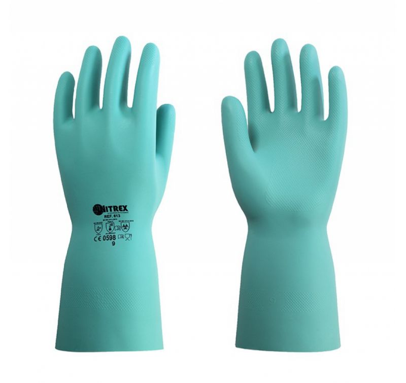 Chemical protection gauntlet made of 0.38 mm thick green nitrile. and with flocked cotton interior for sweat absorption and comfort of use. Diamond grip finish on the palm to improve real grip and length 33 cm. Cut edge.