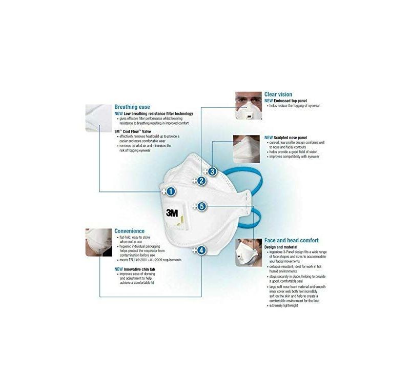 3M™ Aura™ 9300+ Series Self-Filtering Particulate Respirators are the result of 3M's ongoing effort to improve the comfort of users of our products. The ingenious and innovative 3-panel design adapts to different facial profiles of multiple shapes and sizes; allowing greater facial movement during the work day, which translates into greater comfort for the user.