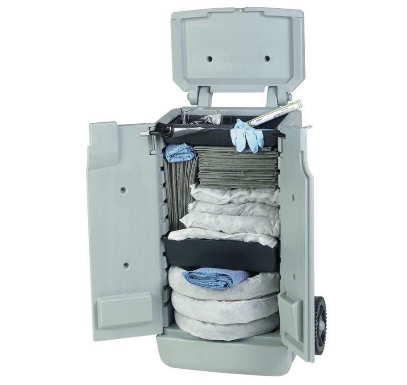 Anti-pollution kit for chemicals in a mobile cart with 2 front doors with wheels and handles, 75 liters.