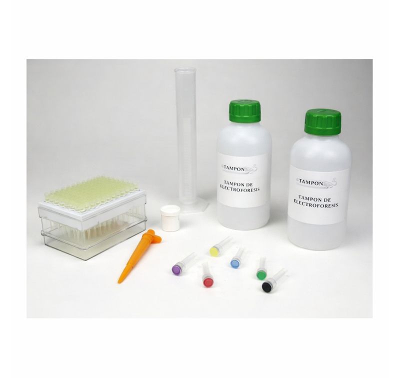 Contenido: tampón de electroforesis concentrado 2x50 ml (para crear 2 envases de 500 ml añadiendo agua destilada); agarosa 1,75 g; 1 micropipeta 20 µl; 1 rack de puntas; 4 microtubos de muestras; 1 probeta de 50 ml; 1 DanaBlue 0,1 % 400 ml; 1 DanaBlue 0,02 % 125 ml.