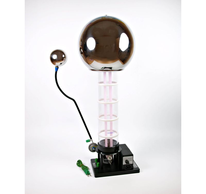 Para la generación de voltajes extremadamente altos con baja intensidad. Funcionamiento inmejorable con un diseño robusto y fácil de desmontar para ver su funcionamiento. Capaz de alcanzar hasta 400KV. Longitud de chispa de unos 150 mm entre esferas.