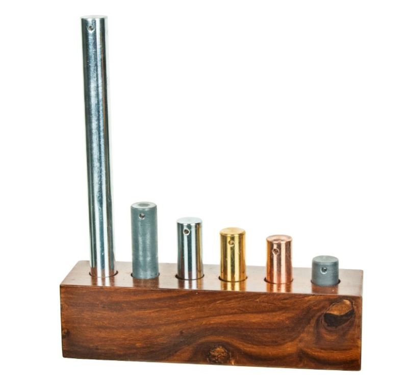 Juego de 6 cilindros metálicos de igual masa. Incluye cobre, plomo, latón, zinc, hierro y aluminio. Cada uno de los seis metales de este juego varía en longitud, de 5 cm a 19 cm, pero tienen la misma masa de 100 g y un diámetro de 16 mm (0,6"). Cada cilindro cuenta con un orificio perforado en un extremo para su suspensión.
