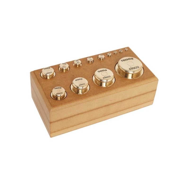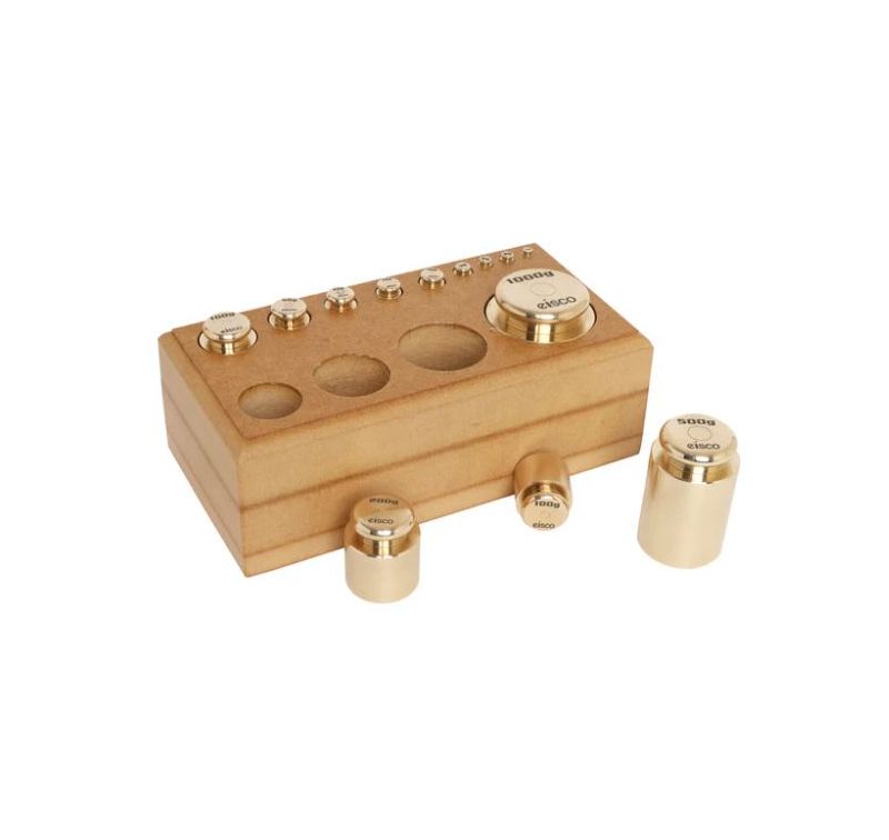 Latón pulido, se suministra con bloque de madera. Latón pulido, se suministra con bloque de madera, como se muestra en la ilustración. Capacidad: 2000 g. Incluye: 1 x 1000 g, 1 x 500 g, 1 x 200 g, 2 x 100 g, 1 x 50 g, 1 x 20 g, 2 x 10 g, 1 x 5 g, 2 x 2 g, 1 x 1 g.