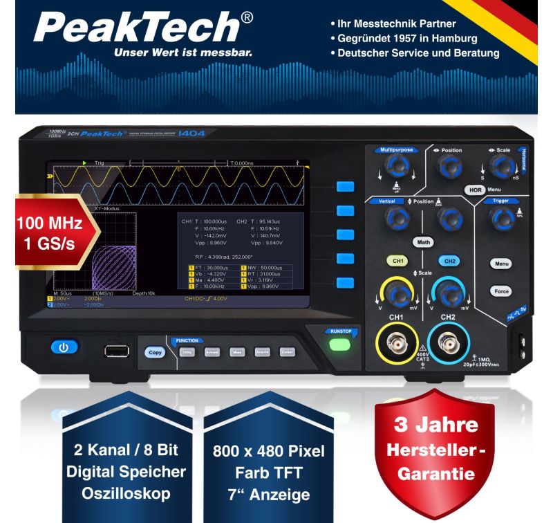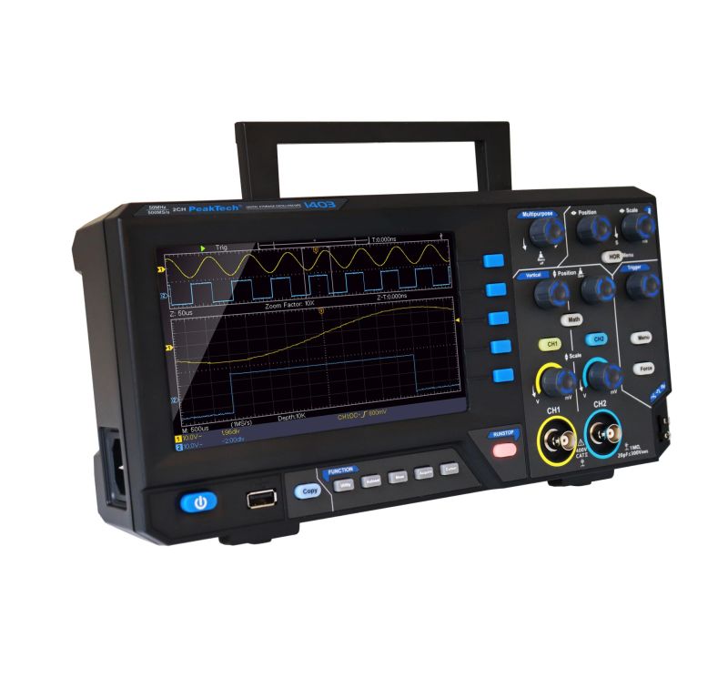 Desarrollada especialmente para el sector de la enseñanza y los aficionados, esta nueva serie de osciloscopios digitales de almacenamiento completo ofrece la mejor relación calidad-precio posible sin tener que renunciar a la funcionalidad ni a las características técnicas. Ya sea el Autoset y el Autoscale, las funciones de medición matemáticas, el modo FFT, Cursor o XY e incluso una función de zoom, todas las funciones estándar del mercado están ya integradas en esta serie. El almacenamiento de datos de las formas de onda es interno con memoria para 16 formas de onda o externo en una memoria USB en formato TXT, CSV o BIN, que puede leerse con el software incluido. Las configuraciones también se pueden guardar internamente o se pueden guardar externamente capturas de pantalla de la pantalla. La visualización de las formas de onda puede lograrse de forma rápida y sencilla a través de la función Autoset, a través de AutoScale las formas de onda medidas pueden visualizarse de forma aún más precisa según las necesidades, aunque estos ajustes también pueden realizarse, por supuesto, de forma completamente manual a través del control de teclas.