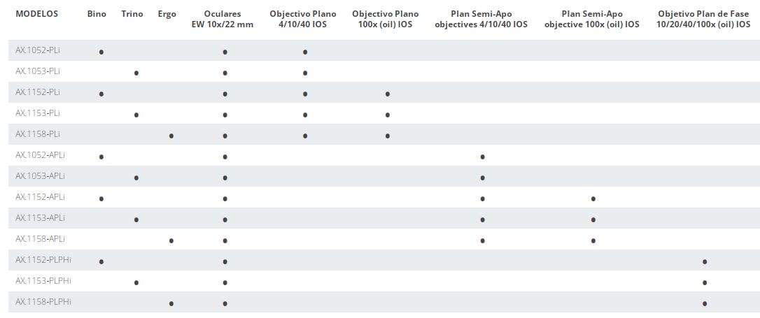 Este modelo viene provisto de objetivos con corrección al infinito planos, planos para contraste de fase, y semi-apocromáticos EIS de 60mm y rosca de fijación M25